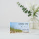 This business card has a tranquil beach scene. A soft blue sky with tufts of grass in the foreground. Pure white sand leads to the sea.