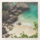 Sandy Beach Cove with Green Trees, Rocks & Ocean Glass Coaster