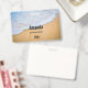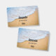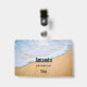 Name tag with a photograph of a golden brown sandy beach with white foamy surf.