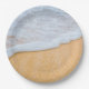 Paper plates with a photograph of a golden brown sandy beach with white foamy surf.
