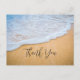 Thank you postcard with a photograph of a golden brown sandy beach with white foamy surf and blue water.