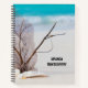 Spiral notebook with a gorgeous photograph. Tropical blue water and foamy surf in the background. A collection of seashells and stems set on a white sandy beach.