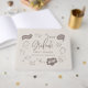 A beautifully presented guest book which came with a lovely gift box for storage. The book was hard back so stayed fresh after being handed around to all our wedding guests. We had lots of compliments about the design which went perfectly with our theme. Perfect, no issues at all with the printing. It arrived on time and came well packaged.