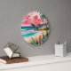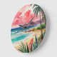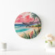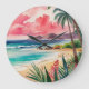 A peaceful tropical shoreline where golden sand meets rolling turquoise waves. Lush palm trees sway under a dreamy pink and teal sunset. The perfect escape for those who love the beach and ocean breeze.