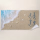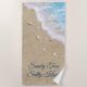 Beautiful blue beach waves rolling up on soft beach sand covered in pretty seashells decorate this beach towel, with the customisable saying, Sandy toes Salty Kisses.