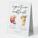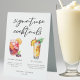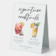 This chic signature cocktails table tent sign features simple black typography above 2 drinks and their ingredients for your wedding bar. A cute summer Sangria and Piña Colada drawing add a cool flair to your bar menu. Complete with the couple's names and date for their reception.