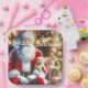 A cute watercolor style ai art depicting Santa holding a puppy dog on his lap on Christmas Eve with vintage vibes. Christmas party paper plates.