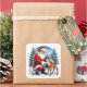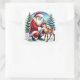 Santa Claus, dressed in his iconic red suit, kneels in a snowy forest surrounded by evergreen trees. He gently pets a young reindeer with white spots, creating a heartwarming moment filled with holiday cheer and magic of winter.