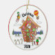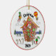 This Christmas ornament features a fun comic illustration of Santa Claus in a gingerbread house covered in colourful candy. Notice the elf on the rocket, another in a hot air balloon, one waving to Santa, and two more ice skating on a pond. Look closer and see Rudolph peeking around the corner of the house. The text reads 'Christmas' '2020'. You can change the year if you like. Original artwork. Copyright Leah Wiedemer.