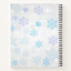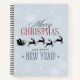 A festive Christmas spiral notebook. A subtle grey background with snowflakes. Fancy trendy lettering which says: Merry Christmas and Happy New Year. With a black silhouette Santa riding in his sleigh being pulled by his reindeer flying across the sky. Snowflake pattern on the back cover.