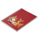 A cute illustration with the holiday spirit. Santa Claus carrying his gift sack and waving hello. His reindeer friend by his side, hanging out by a decorated Christmas tree, with presents all around. Set on a red background with whimsical circles. Festive and cheerful design. Personalise with a name or other custom text.