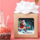 Santa Claus, dressed in a classic red suit, joyfully walks alongside a reindeer. The festive backdrop features a decorated Christmas tree and glistening snow, capturing the magical spirit of the holiday season under a starry night sky.