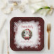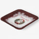 Christmas Baby Shower square Paper Plates with the cutest Little baby polar bear in Santa hat, dark red background and snowflakes. Easily personalise the text. - Kate Eden Art