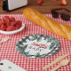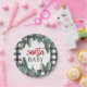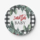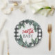 Santa Baby Christmas themed baby shower with christmas greenery and black buffalo plaid.