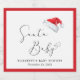 Cute sparkling wine labels for your Christmas baby shower featuring "Santa Baby" in a chic script with a heart swash, a watercolor of Santa's red hat, and the name of the mummy-to-be and the shower date in simple topography.