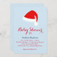 Fancy ribbon script and a red Santa hat accent this icy blue baby shower invitation, making it perfect for the neutral or boy winter, Christmas or holiday time shower.