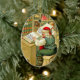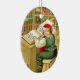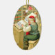 Vintage illustration of Santa Claus sitting at his desk wearing all green except for his red hat. He's carefully checking his list of children who have been nice. The shelves in the background are filled with books of lists as well as toys