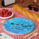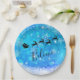 Christmas paper plates with a black silhouette of Santa riding in his sleigh being pulled by his reindeer flying across the sky. Believe written in a trendy script font. The background is an icy blue frosty snowflake design.