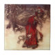 Ceramic Tile featuring Arthur Rackham’s illustration Santa Claus (1907). A red robed Santa Claus carries a bag of Christmas presents in a snowy wood. Elves fly by his side. A jolly gift for Christmas!