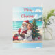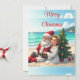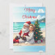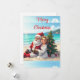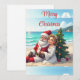 A whimsical holiday scene featuring Santa Claus and a woman in a white dress, seated on a sandy beach. Santa, with his iconic red suit and white beard, smiles warmly as he leans against a decorated Christmas tree.