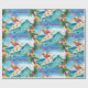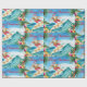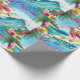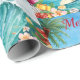 This Surfing Santa Christmas in July Coastal Wrapping Paper features jolly Santa in a Hawaiian floral shirt and red shorts, riding bright turquoise waves under swaying palm trees.