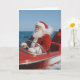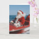Santa Claus joyfully steers a red speedboat across the ocean, with a large sack of gifts beside him, under a bright blue sky that adds to the sense of adventure and fun