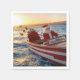 Santa Claus joyfully navigating a speedboat, with a festive red bag overflowing with toys spilling out as he glides across the water