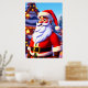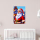 This cartoon shows Santa Claus standing in front of a Christmas home. He is wearing his traditional red suit and hat, and has a long white beard. The home is decorated with lights, ornaments, and tinsel. The background is a snowy winter scene. Other name for Santa Claus, st. Nicholas, Kris Kringle, Father Christmas, Saint Nicholas. This is a AI generated art.