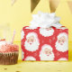 Vintage style illustrations of a Santa Claus face wearing a pink Santa hat are set against a patterned red background on this wrapping paper with a retro look.