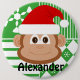 This adorable button makes a perfect name tag to identify Christmas stockings and can be made a tradition by used year after year! Design features a green background with white snowflakes, stripes and argyle design. There is an adorable brown monkey as the main feature of this button. He has huge brown twinkling eyes and a childlike smile on his face. This little brown monkey is all decked out for the holidays by wearing his Santa Claus hat for Christmas. Below this Santa Claus monkey is text in large black font to add the personalisation. Add a name and pin this button to their Christmas stocking so that it is easily identifiable on Christmas morning!
