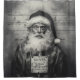 A hyper-realistic, black-and-white depiction of Santa Claus in a mugshot scenario. The detailed image shows Santa in his traditional attire, but with a worn, distressed look, complete with a sign hanging around his neck. Behind him is a vintage measurement chart, adding to the gritty, dramatic tone. This unconventional portrayal gives a mysterious, rebellious twist to the beloved holiday icon.