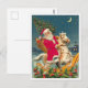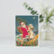 Vintage illustration of Santa Claus on a white wooden horse, carrying a Christmas tree with colorful baubles and a basket full of toys under a clear blue night sky with a bright shining moon and stars on a cold winters night.