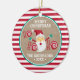 Santa Claus Peppermint Personalised Christmas Ceramic Ornament. Cute Santa Claus design with a candy cane stripe background and peppermint candies.