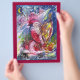 Colourful, whimsical and artistic acrylic painting ,Santa is playing harp in the moonlight ,an owl ,floral ornaments,winter plants,children toys,holly berries in bright red,green,white,blue,yellow colours. by Bulgan Lumini (c)