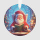 A jolly Santa sits at a desk, candlelit and surrounded by twinkling lights and Christmas trees, reading a green book. Warm, magical, and cozy, it captures holiday family joy.