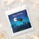 Santa's Sleigh illustration: A ride in the night over the skyline of a city with the night sky and the bright moon and stars in the background.