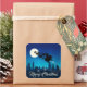 Santa's Sleigh illustration: A ride in the night over the skyline of a city with the night sky and the bright moon and stars in the background.