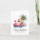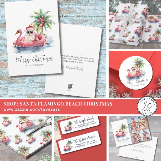 Get into the holiday spirit with this unique folded Christmas card featuring a relaxed Santa Claus in sunglasses lounging in a pink flamingo floaty out in the ocean. Perfect for sending beachy holiday wishes, this card is great for anyone living in tropical places like Florida, Hawaii, or the Bahamas—or anyone who simply loves a coastal vibe.