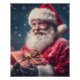 Festive image of Santa Claus holding a wrapped present amidst gently falling snowflakes. Capturing the warmth and joy of Christmas, Santa stands in his classic red suit with a joyful smile, ready to spread holiday cheer.