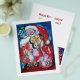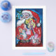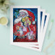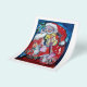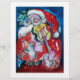 Colourful, whimsical and artistic acrylic painting ,Santa is playing violin in the snowy winter night ,an owl ,floral ornaments,winter plants, holly berries in bright red,green,white,blue,yellow colours.
