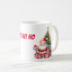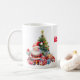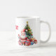 Winter holiday theme design features watercolor illustration of Santa Clause, festive Christmas tree and pile of gift boxes. Personalise with name or personal message. Perfect holiday gift for anyone.