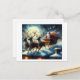 A whimsical scene captures Santa Claus riding his sleigh across a snow-covered rooftop under a glowing full moon. Three reindeer lead the way, creating a magical atmosphere as snowflakes fall gently around them.