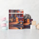 A warm and cozy Christmas scene featuring Santa Claus standing by a crackling fireplace. Santa, dressed in his classic red suit with white fur trim, holds a beautifully wrapped gift with a golden ribbon. The room is decorated for the holiday, with a brightly lit Christmas tree adorned with ornaments, garlands, and a shining star at the top. Colorful presents are neatly arranged around the tree and by the hearth. The mantel above the fireplace is decorated with candles and a festive wreath with a red bow. Through the window, a snowy evening can be seen, completing the enchanting Christmas atmosphere.
