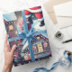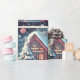 Each segment of the design includes snow-covered houses adorned with twinkling Christmas lights, surrounded by gently falling snowflakes. The vibrant color palette of reds, whites, and gold accents against the cool blues evokes the magic and warmth of the holiday season.