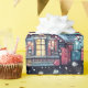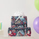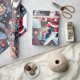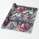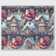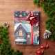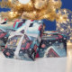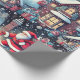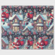 This Santa Delivering Presents Wrapping Paper features a heartwarming and festive design. It showcases Santa Claus joyfully climbing down chimneys with his sack overflowing with gifts. The repeating pattern is set against a deep blue, snow-dappled night sky, creating a cozy winter atmosphere.