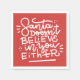 Bring a touch of humour to your holiday decor with this playful design featuring the phrase "Santa Doesn’t Believe in You Either." Perfect for those who love a bit of cheeky fun, this graphic can be applied to a variety of products, making it an ideal gift or decorative piece for the festive season.