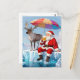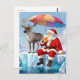 Santa sips a beer on an iceberg under a beach umbrella with one of his reindeer on a much needed vacation