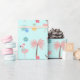 NewParkLane - Tropical Christmas Wrapping paper, featuring a fun colourful pattern of pink flamingo's wearing Santa hats, with palm trees, pineapples and presents, against a aqua blue / turqoise background.