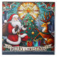 A jolly Santa Claus presents a gift to a friendly reindeer beside a beautifully decorated Christmas tree, surrounded by colourful presents and vibrant stained glass.