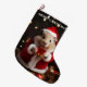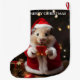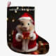 Add a touch of cuteness to your Christmas decor with this charming Christmas stocking featuring an adorable hamster dressed as Santa Claus. This delightful design captures the festive spirit with the hamster wearing a red Santa suit and hat, holding a small, wrapped gift. The background sparkles with cosy Christmas lights and is decorated with ornaments and presents, creating a warm and inviting scene. The top of the stocking proudly displays the message "MERRY CHRISTMAS", making it a perfect addition to your fireplace mantle or a special gift for any hamster this Christmas season. generativecontent